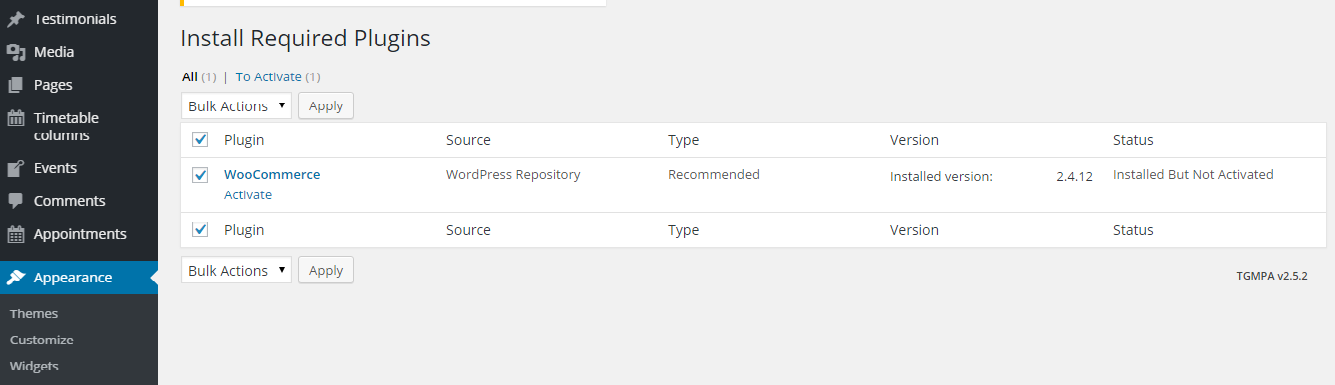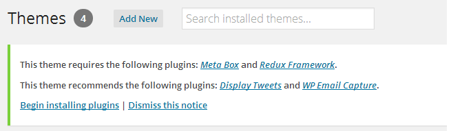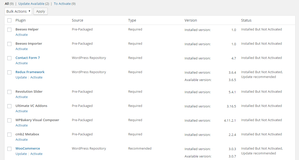 After you have activated the Beeseo theme, WordPress is showing list of required and recommended plugins on dashboard.You can install plugin by clicking Begin installing plugin but if you have already hide it out this notice, you can Go to Appearance > Install Plugins