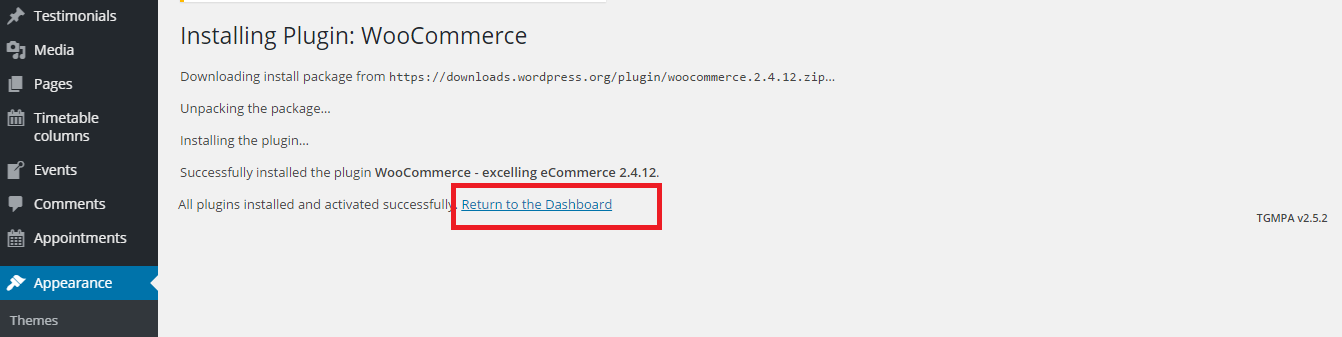 After Install and Active WooCommerce Click on Return to the Dashboard .